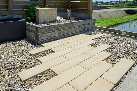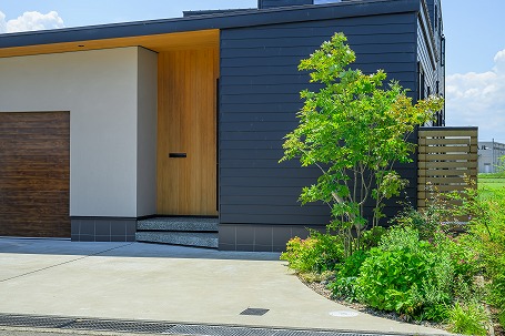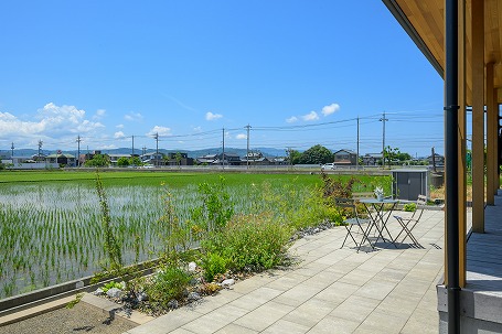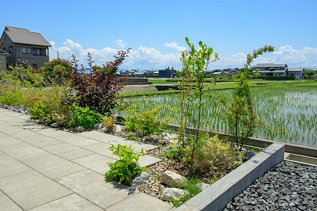 玄関アプローチ付近は緑豊かに、住宅のデッキとつながる裏庭はお子さまの遊びやすさを重視し開放的に、それぞれ違った雰囲気に仕上げました。裏庭は隣接する広々とした田んぼを借景に、フェンスで囲わず植栽で緩やかに空間を仕切りました。片隅には愛犬のお墓を花壇のように設け、ご家族の思い出を受け継ぐお庭が完成しました。
