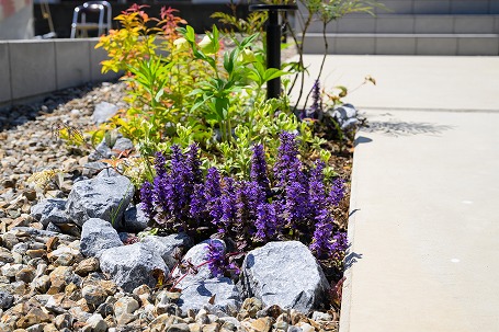 アプローチの動線を変化させ、植栽を配置しました。